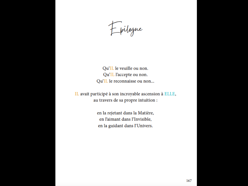 Au fil des pages, je te partage l’Amour Sacré, le vrai : la vulnérabilité, le désespoir, la confiance, la mort, la renaissance, la force, la peur, la sagesse, la maturité, le surnaturel et l’éternel...